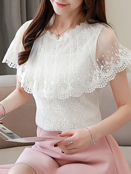 Spring Summer Chiffon Round Neck Plain Petal Sleeve Short Sleeve Blouse