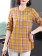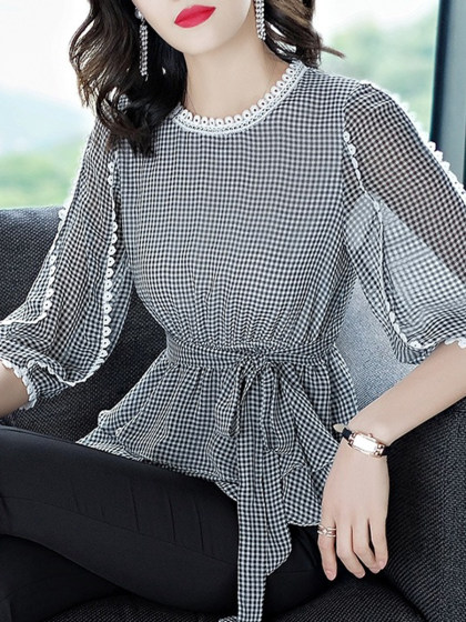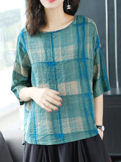 Round Neck Plaid Stitching Five-Point Sleeve Blouse