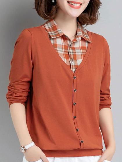 Fake Two Loose Plaid Shirt Stitching Knitted Pullover