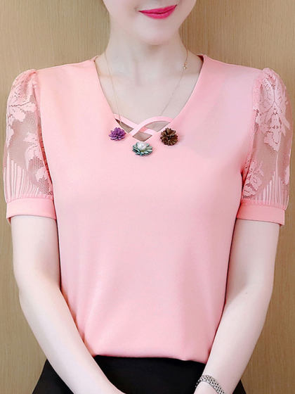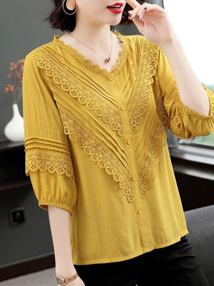 V-neck Chiffon Lace Stitching Five-Point Sleeve Blouse