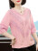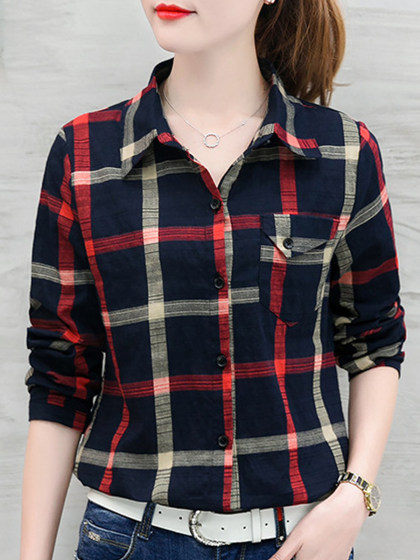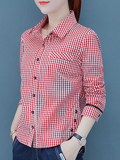 Turn Down Collar Decorative Buttons Checkered Blouses