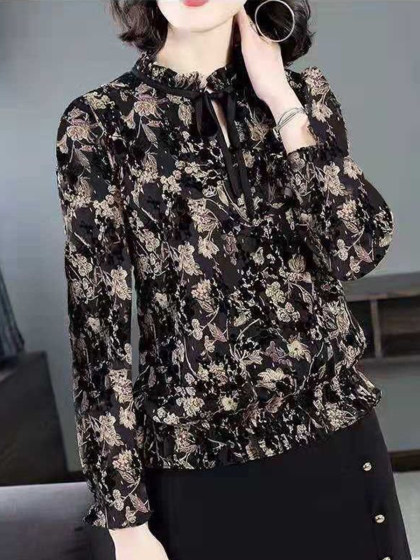 Stand-up Collar Chiffon Print Long Sleeve Blouse
