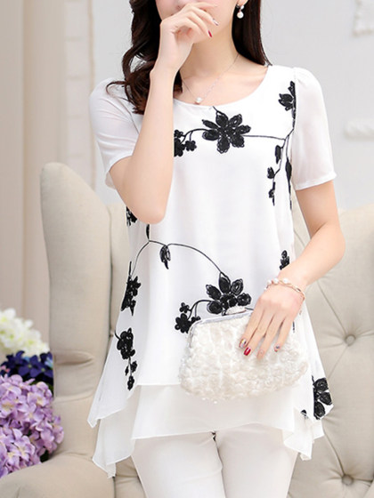 Floral Embroidery Asymmetric Hem Round Neck Blouse