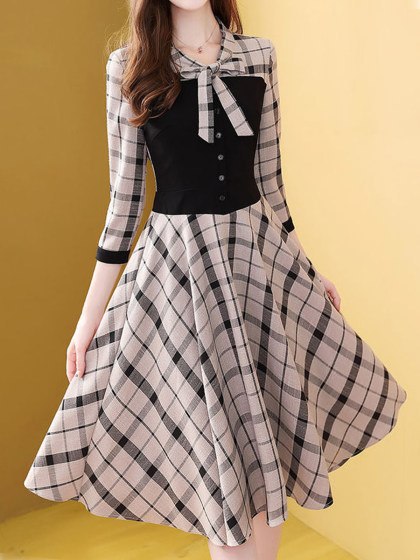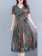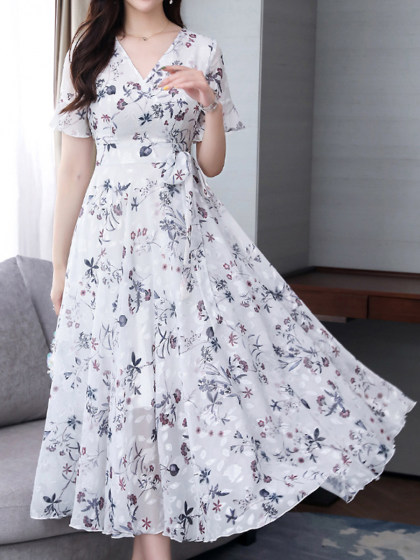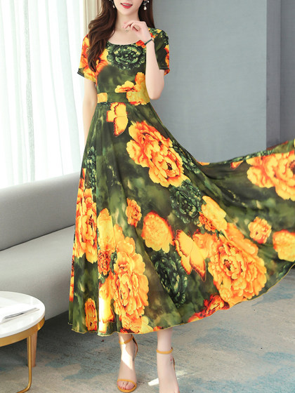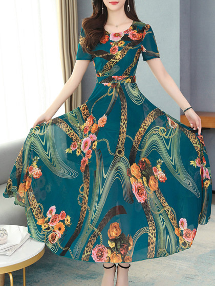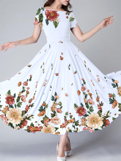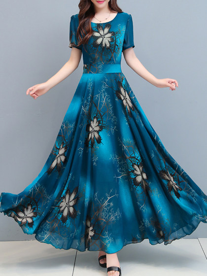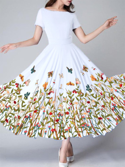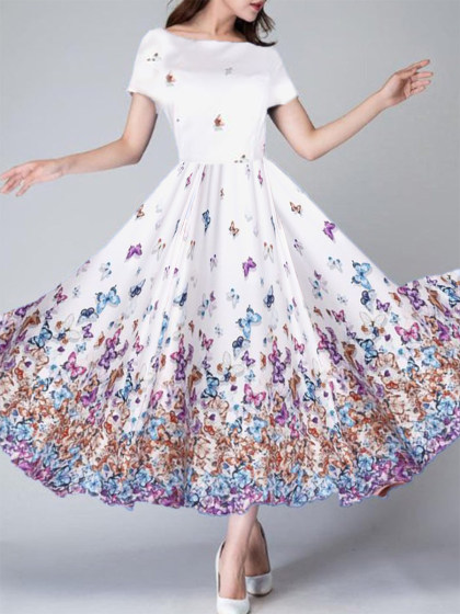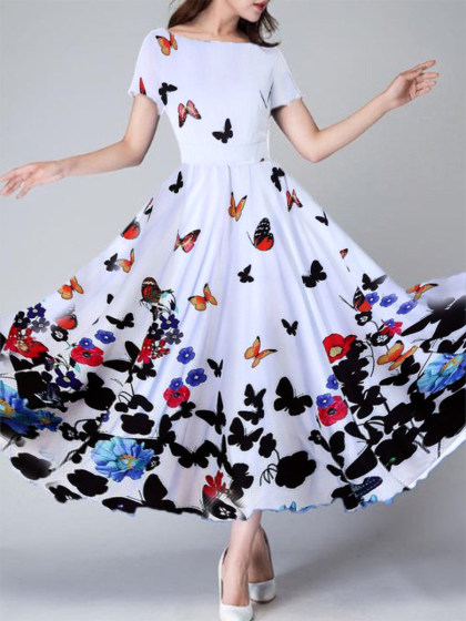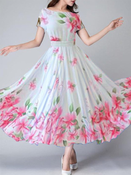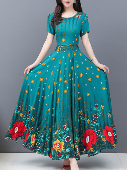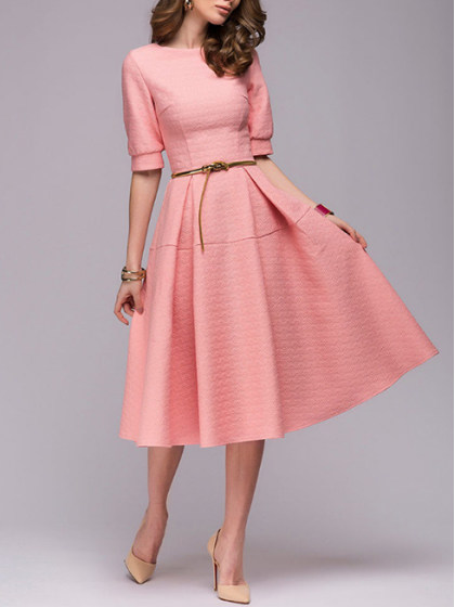 Waist Flared Short-sleeved A-line Knee Length Maxi Dress