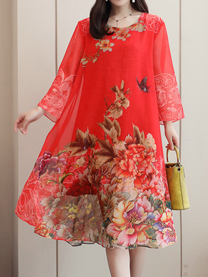 Round Neck Patchwork Floral Printed Bell Sleeve Shift Dress