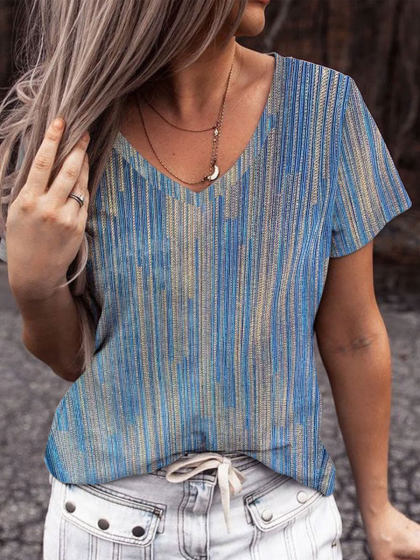V-neck Loose Casual Striped Print Short Sleeve T-shirt