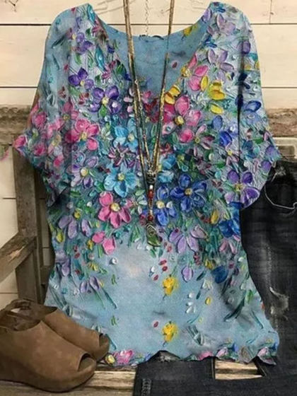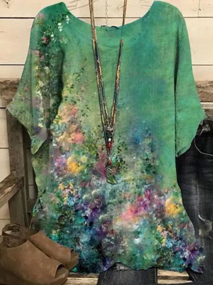 Cotton And Linen Loose Oil Painting Print Short-sleeved Blouse