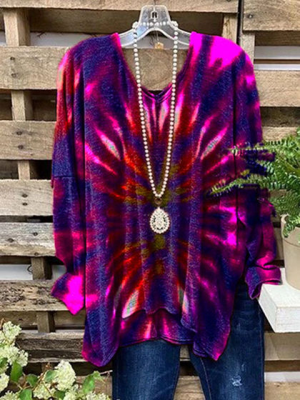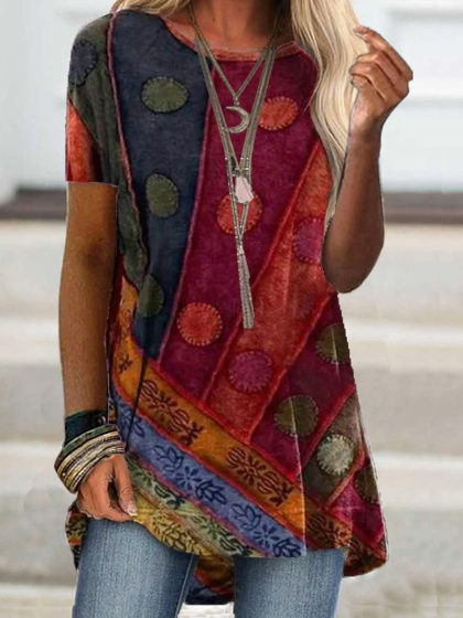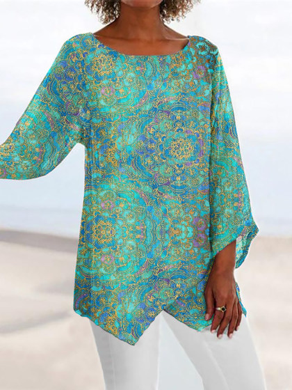 Round Neck Retro Print Loose Casual Long Sleeve Blouse
