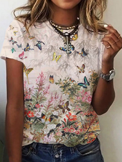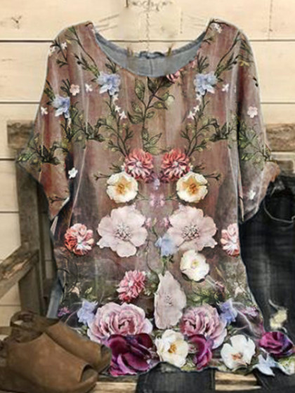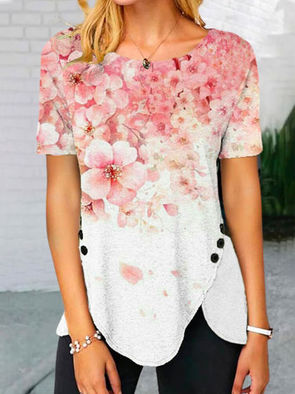 Round Neck Loose Casual Floral Print Short Sleeve T-shirt