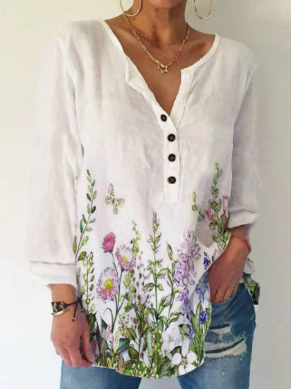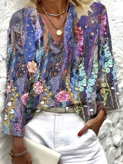 V-neck Floral Print Casual Loose Long-sleeved Blouse