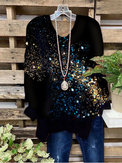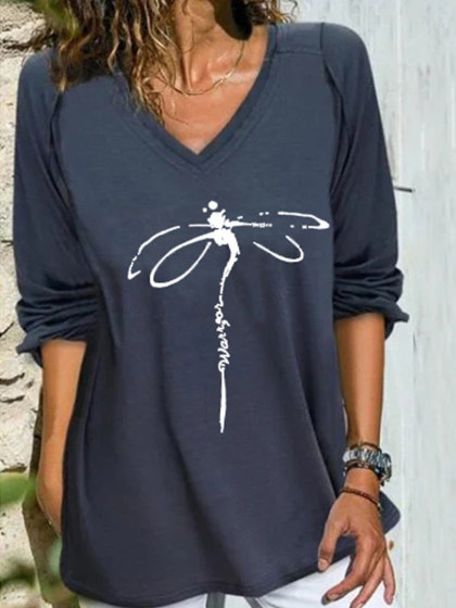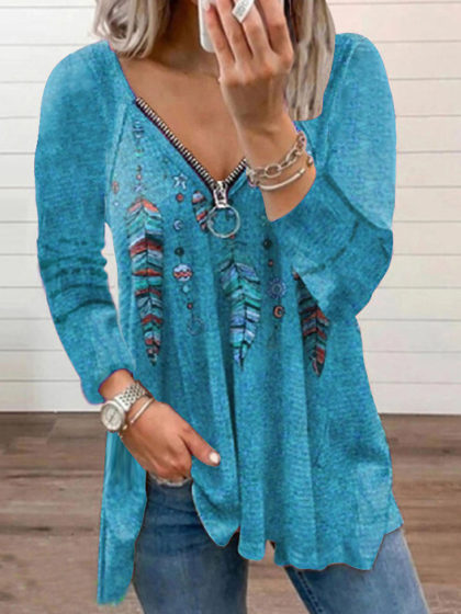 V-neck Feather Print Casual Long Sleeve T-shirt