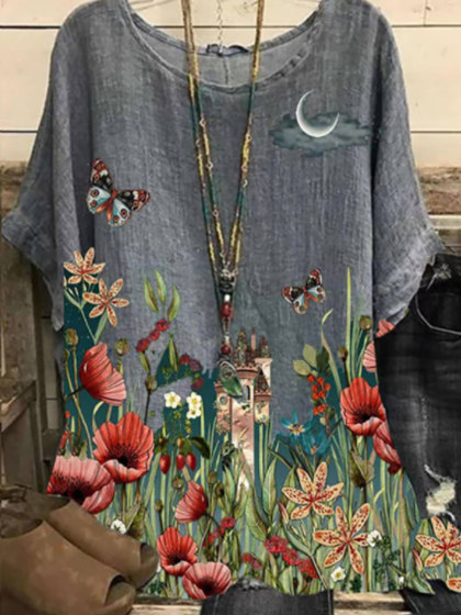 Round Neck Casual Loose Floral Print Short Sleeve T-shirt