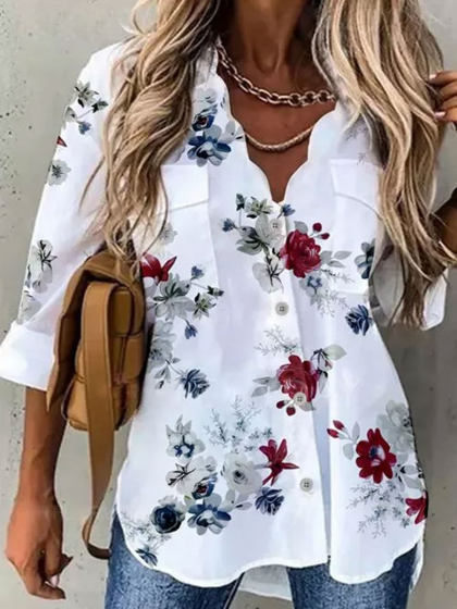 Casual Flower Print Lapel Long-sleeved Casual Blouse