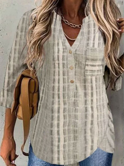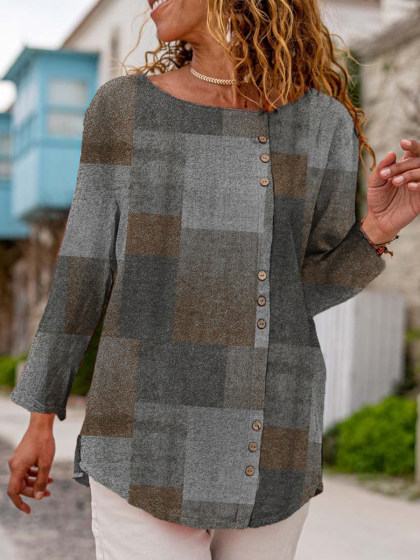 Check Gradient Print Loose Casual Long Sleeve Blouse
