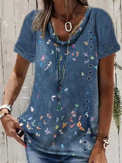 Ladies V-neck Printed Cotton Short-sleeved Blouse