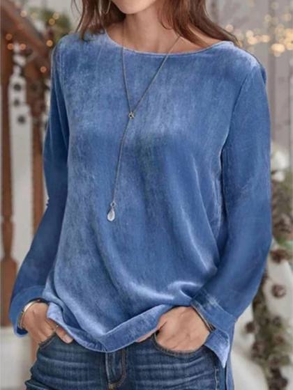 Solid Color Casual Round Neck Long Sleeve Blouse