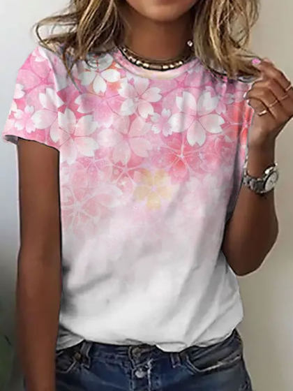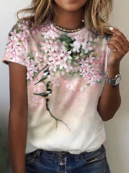Round Neck Loose Casual Sakura Print Short Sleeve T-shirt