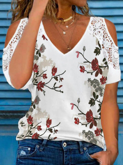 Casual Floral Print V Neck Lace Short Sleeve T-Shirt