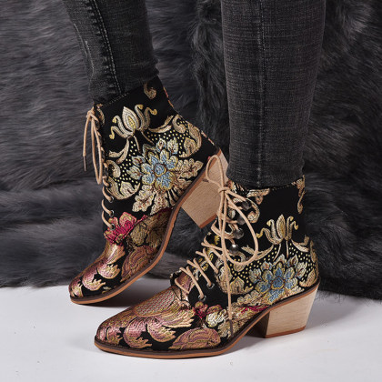 Women's Thick Heel Pointed Toe Embroidery Boots