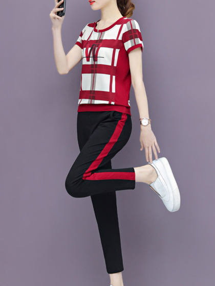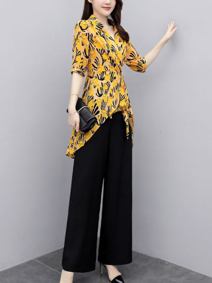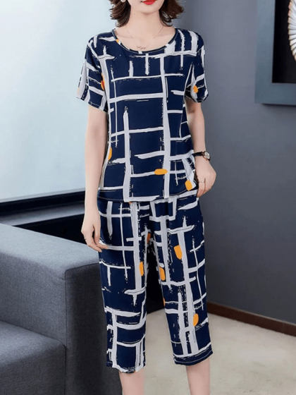 Round Neck Short Sleeve Printed Wide Leg Pants Suit